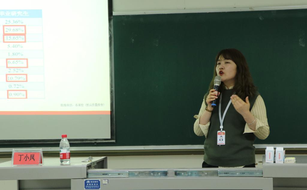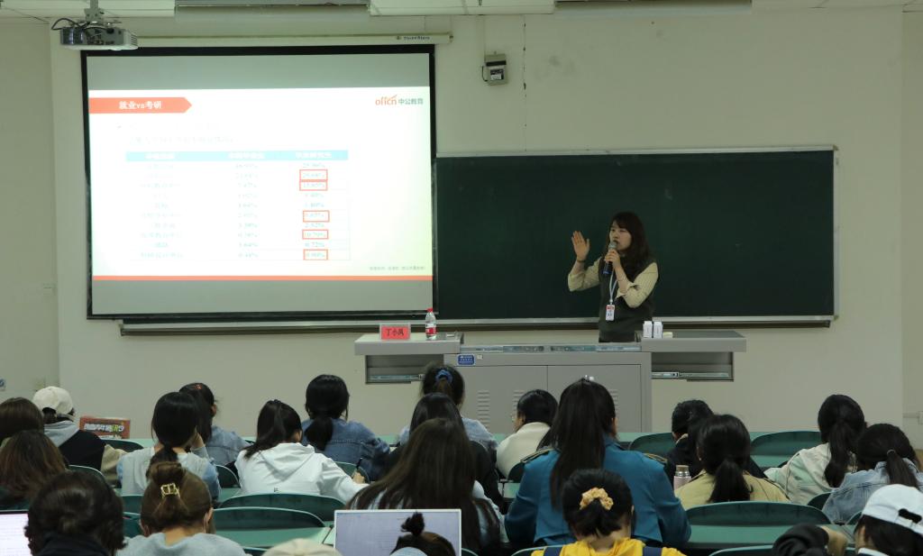 丁小凤首先对在场学生的考研意愿做了大致了解,随后阐述了现今的考研趋势。在对比本科毕业生与硕士毕业生的毕业选择——就业或考研之后,点明硕士毕业生具有薪酬待遇更高、平台资源更优质、社会环境更重视、眼界格局更宽广的优势。