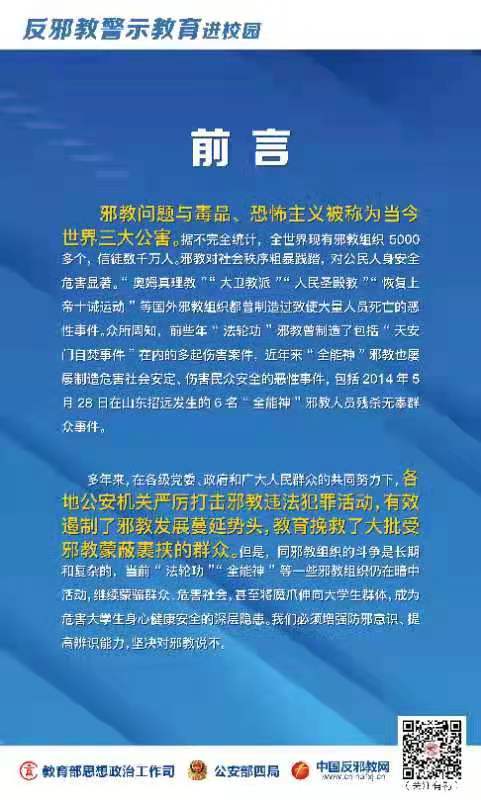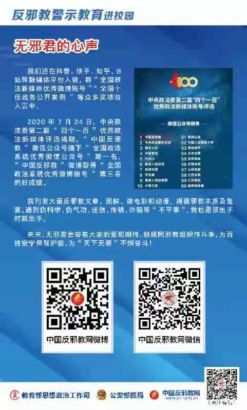 多年来,在各级党委、政府和广大人民群众的共同努力下,各地公安机关严厉打击邪教违法犯罪活动,有效遏制了邪教发展蔓延势头,教育挽救了大批受邪教蒙蔽裹挟的群众。但是,同邪教组织的斗争是长期和复杂的,当前“法轮功”“全能神”等一些邪教组织仍在暗中活动,继续蒙骗群众、危害社会。我们必须增强防邪意识、提高辨识能力,坚决对邪教说不。