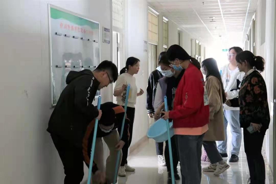 同学们按照任务分工,有的手持扫把、簸箕,打扫地面上的垃圾;有的手持抹布、水桶,擦拭桌面上的灰尘;有的则负责摆放、整理书籍。经过一个小时的努力,学院办公室、会议室变得更加整洁了。