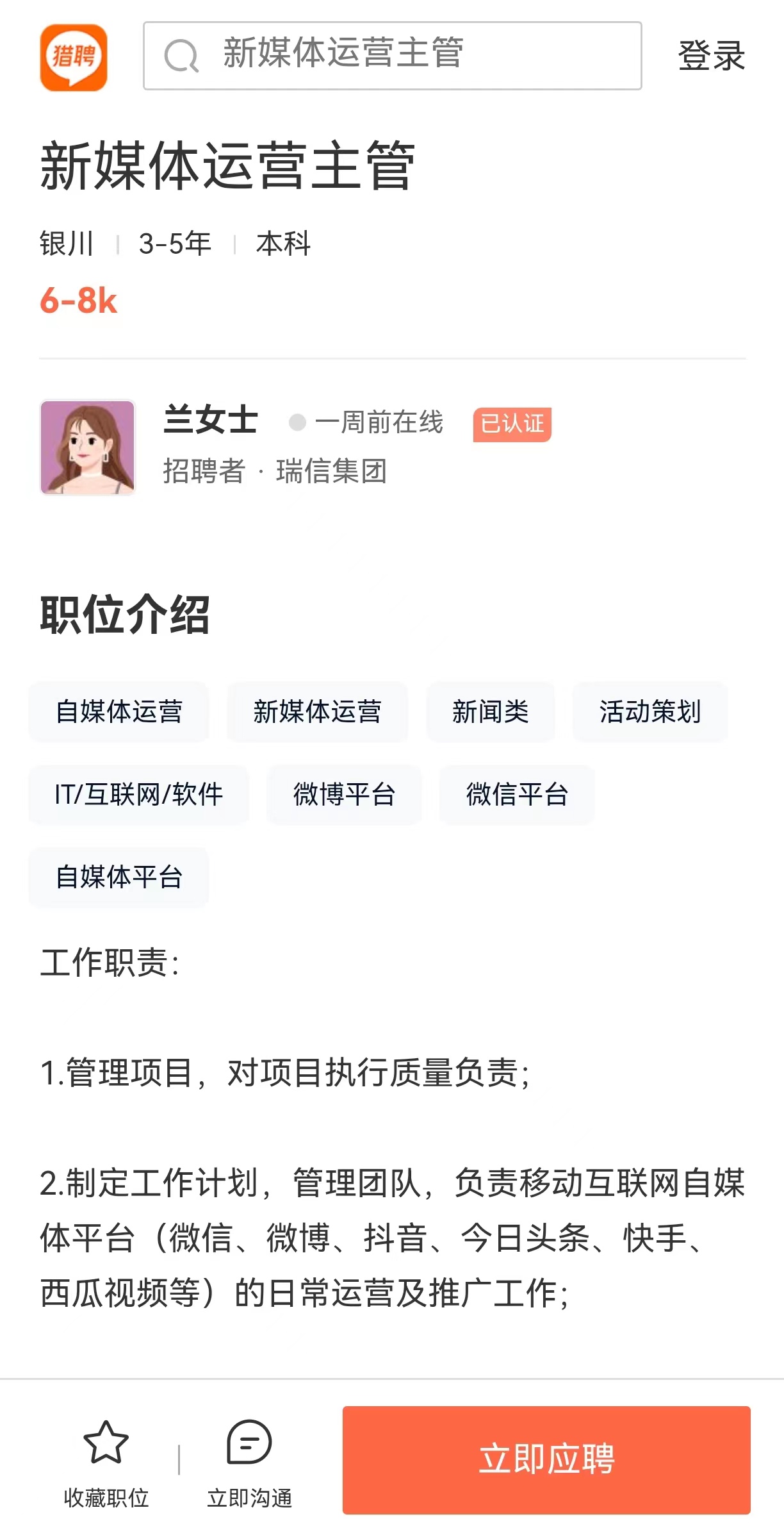 岗位:新媒体运营主管