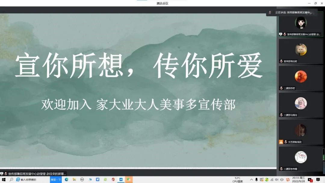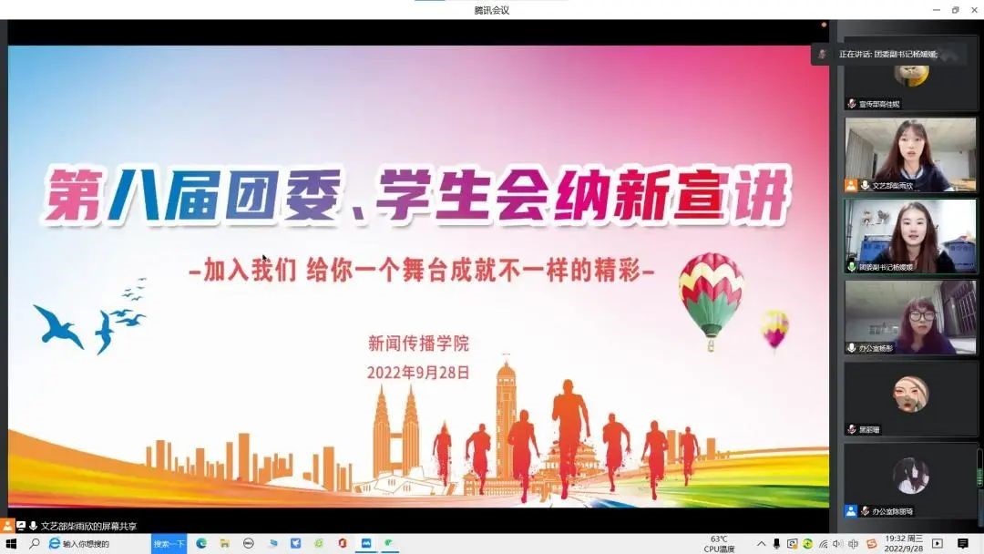 为增进2022级新同学对学院团委、学生会各部门的了解,鼓励同学们积极加入团学组织,9月28日晚,我院开展第八届团委、学生会纳新线上宣讲会。办公室工作人员2021级杨彤和文艺部工作人员柴雨欣主持宣讲活动。