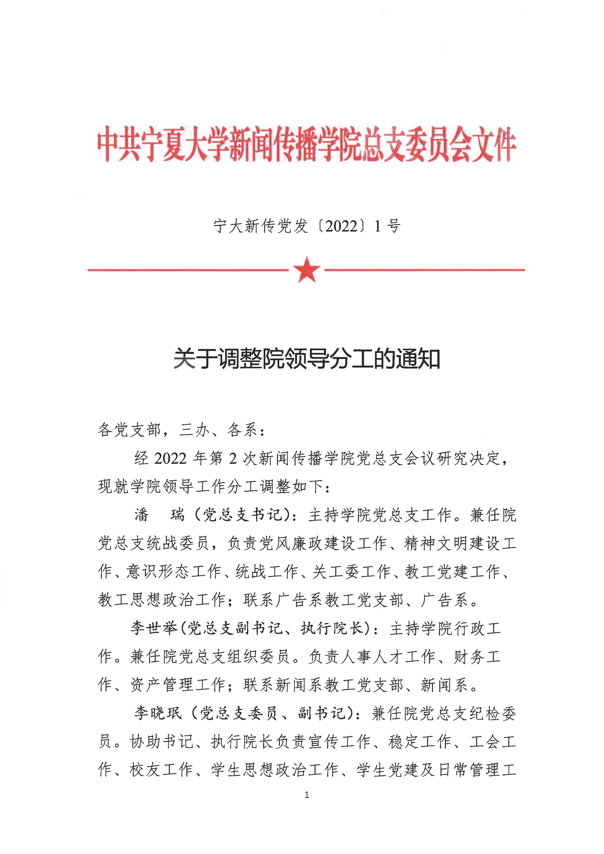 宁大新传党发〔2022〕1号 关于调整院领导分工的通知