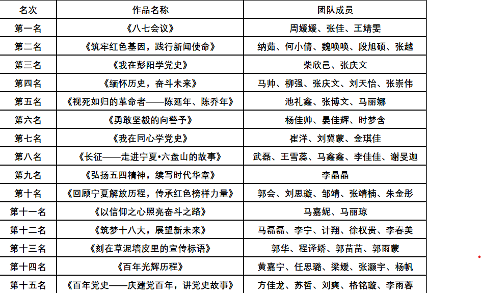 党委学生工作部(学生处)批准,将优秀奖名额由十个增加至十五个。评委们依据评审规则,秉持公平、公正、公开的原则,根据视频作品主题和内容、视频制作、表达能力等各方面认真评选,最终确定了“重温百年党史 传承信念担当” 第二届“学霸小讲堂”短视频大赛优秀奖名单。