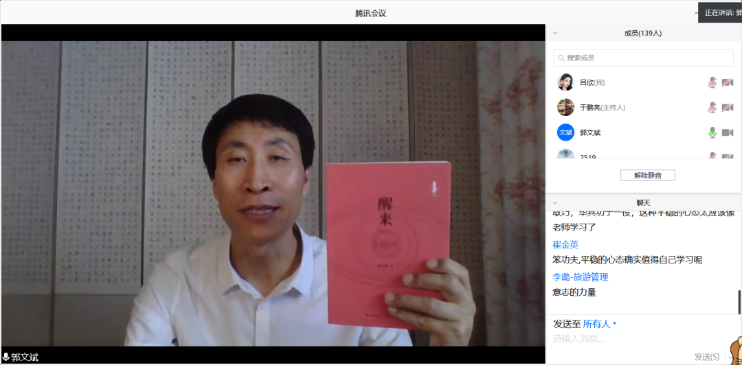 讲座最后,郭文斌老师就同学们提出的问题进行了深入的探讨和详尽的解答。师生们一起分享了“天人合一”在生活中的具体表现,探讨了给予他人帮助有无“度”的限制,以及给予的细分化等问题,令同学们受益匪浅。
