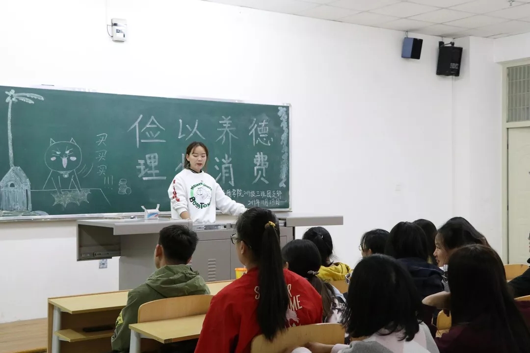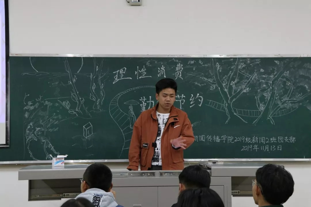 活动中,各班团支书带领同学们通过观看视频、幻灯片等形式,围绕主题“俭以养德”的含义,为大家梳理“俭”与“德”关系,号召同学们从自身做起,树立节俭意识,并组织同学们对非理性消费进行了热烈讨论。2019级新闻二班马帅同学说到:“大学生消费欲望高但挣钱能力弱,很容易因一时冲动而陷入消费的泥潭中难以自拔,从而影响到学业与生活,甚至走上不法之路。”他提倡同学们理性控制自己的消费,对自己的财产做出合理的规划,树立科学理性的消费观。