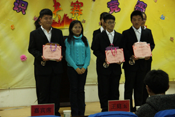 通过预赛和复赛的角逐,“万事通”队、“铁血”队、“-三剑客”队、“026没1”队四支队伍脱颖而出。比赛一开始,精彩的开场舞蹈一下子带动了现场气氛,同学们激情满怀,斗志昂扬,选手们的VCR展示也温馨满满,其中最出彩的VCR非“-三剑客”队莫属了,他们邀请了清华大学、北京大学、中国人民大学等国内著名大学的许多朋友来助阵,不仅增加了比赛的丰富趣味性,也向我们展示了他们良好的人际交往能力。比赛主要分三个环节:必答题环节、抢答题环节和风险题环节。同学们巧舌如簧,竞争非常激烈,场下的观众也连连叫好,与观众的互动让气氛达到了高潮。最后,“-三剑客”队在经过激烈的角逐成功夺冠。