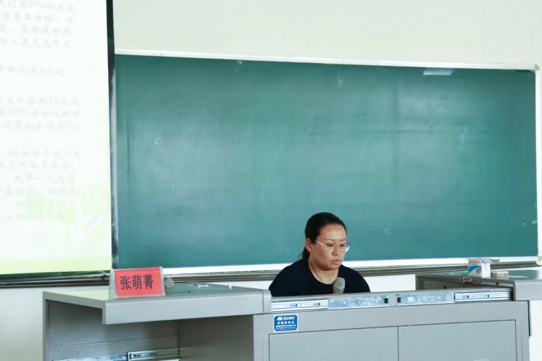 张萌菁首先从本次讲座的意义的入手,她指出勤俭节约是中华民族的传统美德,希望同学们能够从本次讲座中有所收获,坚决抵制“舌尖上的浪费”。张萌菁例举了目前我国与世界的人口数量、粮食生产量等多个数据,并与同学们分享了粮食生产供应的约束条件,借此点出大家仍然需要重视粮食安全问题。她表示:“手中有粮,心中不慌。大家要居安思危,杜绝粮食浪费。”