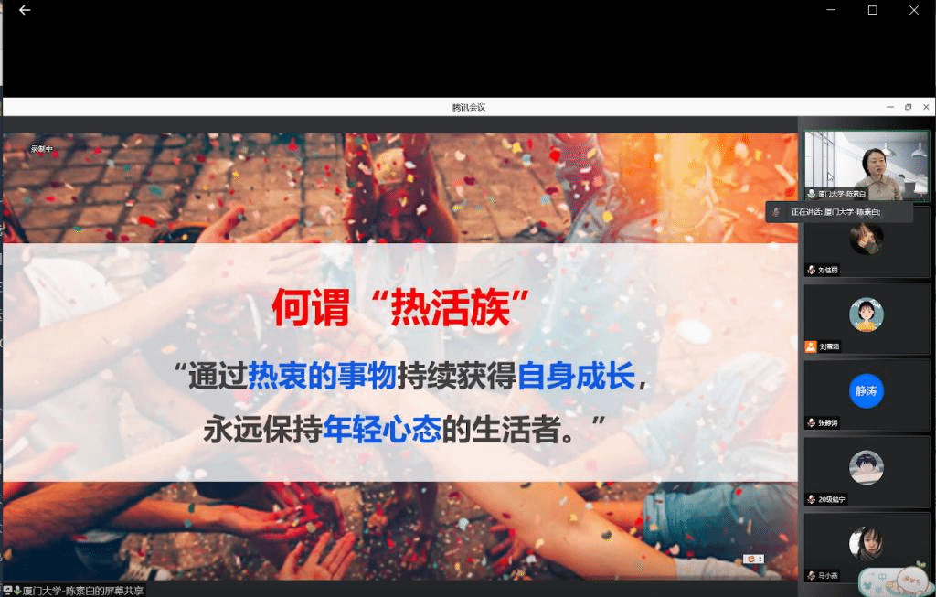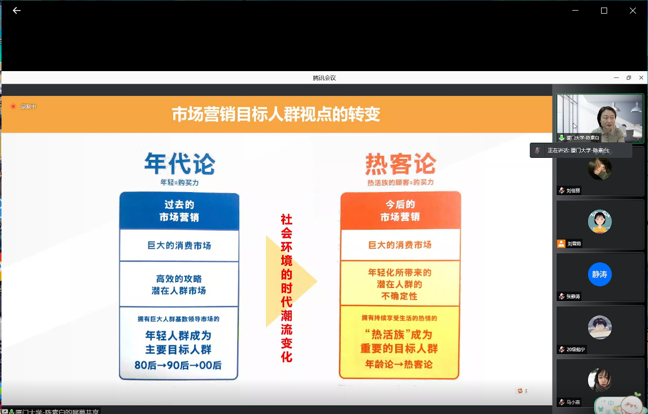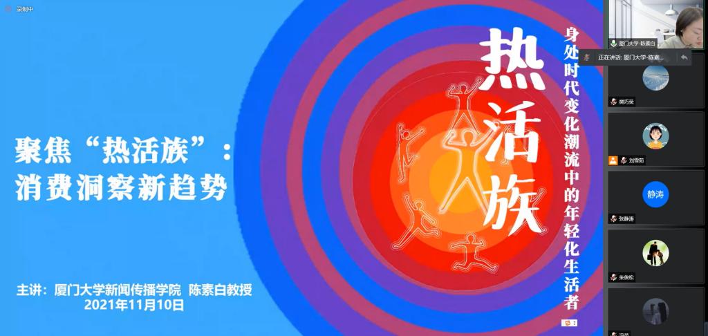 副院长、广告学系教授、博士生导师、美国伊利诺伊大学香槟分校媒体学院访问学者陈素白为学生进行以《“热活族”:身处时代变化潮流中的年轻化生活者洞察》为主题的线上学术讲座。本次讲座由我院副院长张静涛主持,学院广告班全体学生参加。
