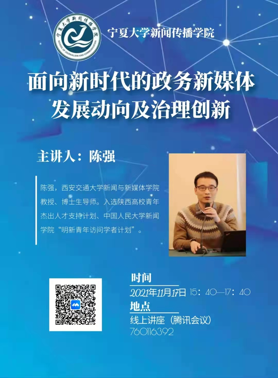 陈强,西安交通大学新闻与新媒体学院教授、博士生导师,研究方向为大数据舆情与政务新媒体、新媒体与社会治理。入选陕西高校青年杰出人才支持计划、中国人民大学新闻学院“明新青年访问学者计划”。中国新闻史学会网络传播史研究委员会常务理事、教育部学位与研究生教育发展中心全国专业学位水平评估专家(新闻与传播)、教育部学位与研究生教育发展中心学位论文通讯评议专家等。主持国家社科基金青年项目、中国博士后基金特别资助项目等21项。在Government Information Quarterly, Computers in Human Behavior, Journal of Medical Internet Research, Internet Research,《国际新闻界》等SCI、SSCI和CSSCI期刊发表论文40余篇,1篇SSCI论文入选ESI高被引论文。担任New Media & Society等数十家SSCI/SCI期刊审稿专家。