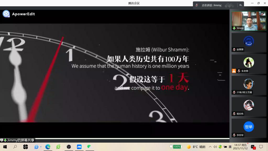 讲座中,季教授以威尔伯•施拉姆“将人类历史压缩为一天”的独特理论开场,对近代新闻学研究历史进行了解读,详细介绍了在德国、瑞士等地诞生的初期新闻学科,阐述了新闻学的历史渊源和发展路程,引起了听讲学生对于国内外新闻学研究者的深刻共鸣,激发了大家对于新闻学框架的求知欲。