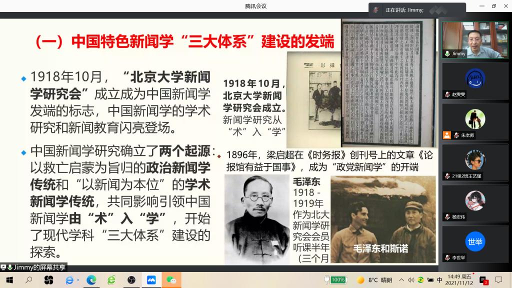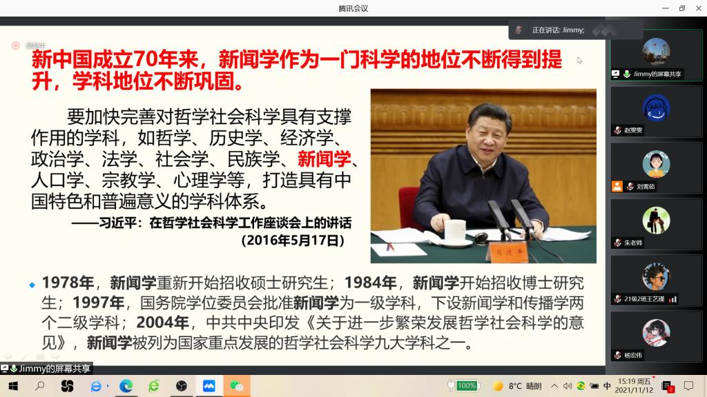 教授、博士生导师季为民开展主题为“中国特色新闻学的'三大体系'的建构”主题讲座,为本科生与研究生进行学科体系构建讲解。本次讲座由我院执行院长李世举教授主持,我院本科生、研究生和部分专业教师聆听了学术报告。