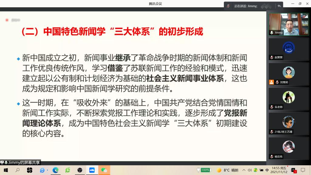 随后,季为民简要地将中国新闻学分为开创奠基、思想回归、改革突破三个历史阶段,并将三个历史阶段中的中国新闻学发展一一讲解。他指出新中国成立70多年来,我国新闻学不断创新发展,建立了以马克思主义新闻观为核心内容的中国特色新闻学,逐步形成了自己的学科体系、学术体系、话语体系。(简称“三大体系”)