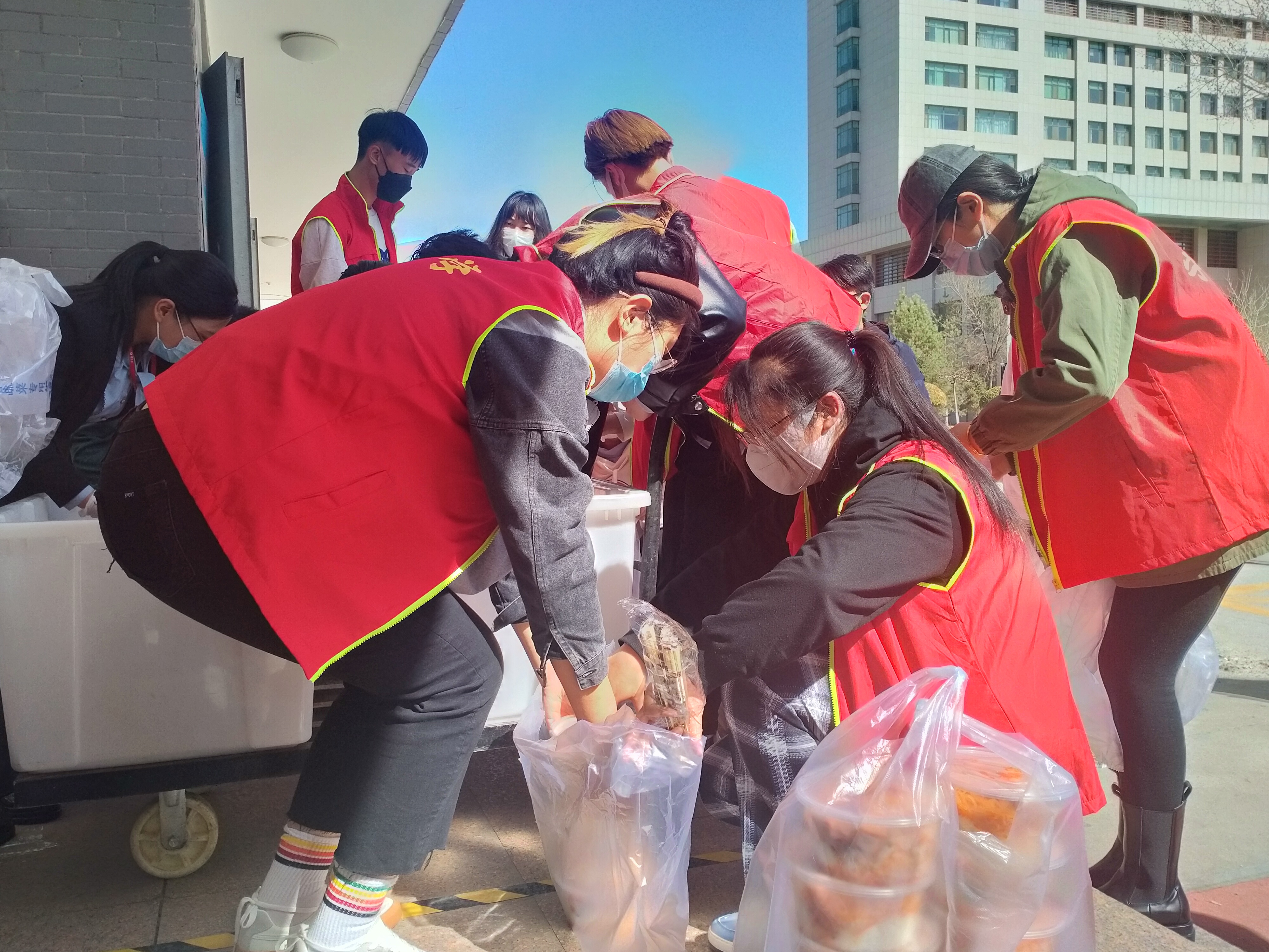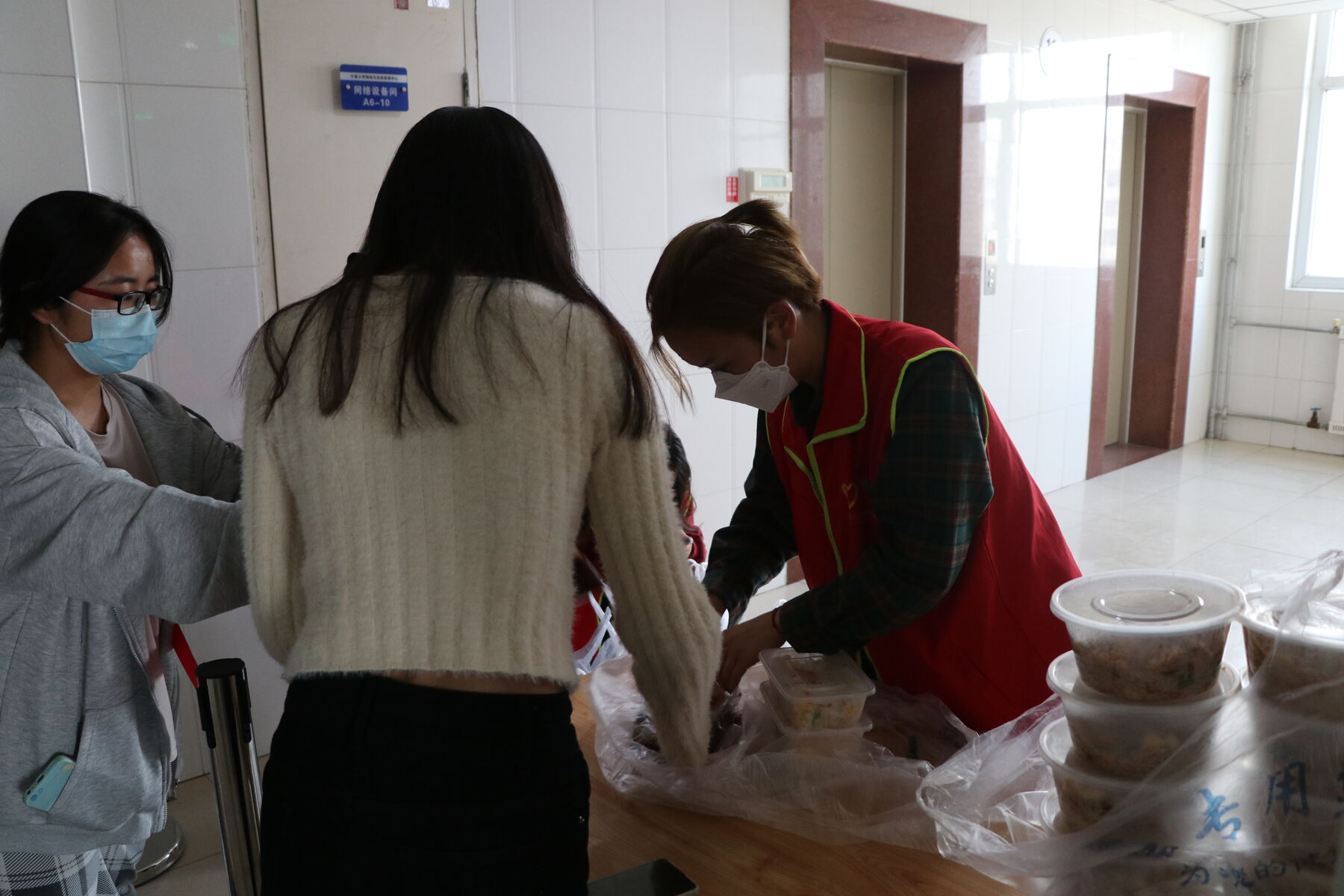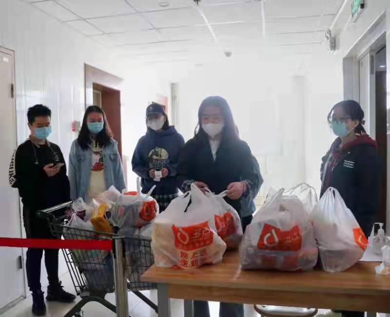 潘瑞代表学院表达了对封控同学的关心,她牵挂着每一位同学们的后勤保障工作,用心解决好同学们的生活饮食问题,同时她向志愿者同学表示感谢:正是他们的无私付出才得以让后勤工作顺利进行。随后,学院领导、老师与志愿者同学进行了亲切的交谈,询问他们工作中的感受以及面临的问题,并表示学院将积极接受反馈,采取行之有效的措施,切实解决同学们的生活、学习之忧。志愿者王硕说道,“院领导们的走访探望让我们深受鼓舞,我们也将不负期望,做好后勤保障工作,帮助封控期间的的同学们解决生活之需。”随后,学院立即为封控中的同学们准备了防疫包,包含口罩、免洗洗手液、消毒洗手液、垃圾袋等必需品。