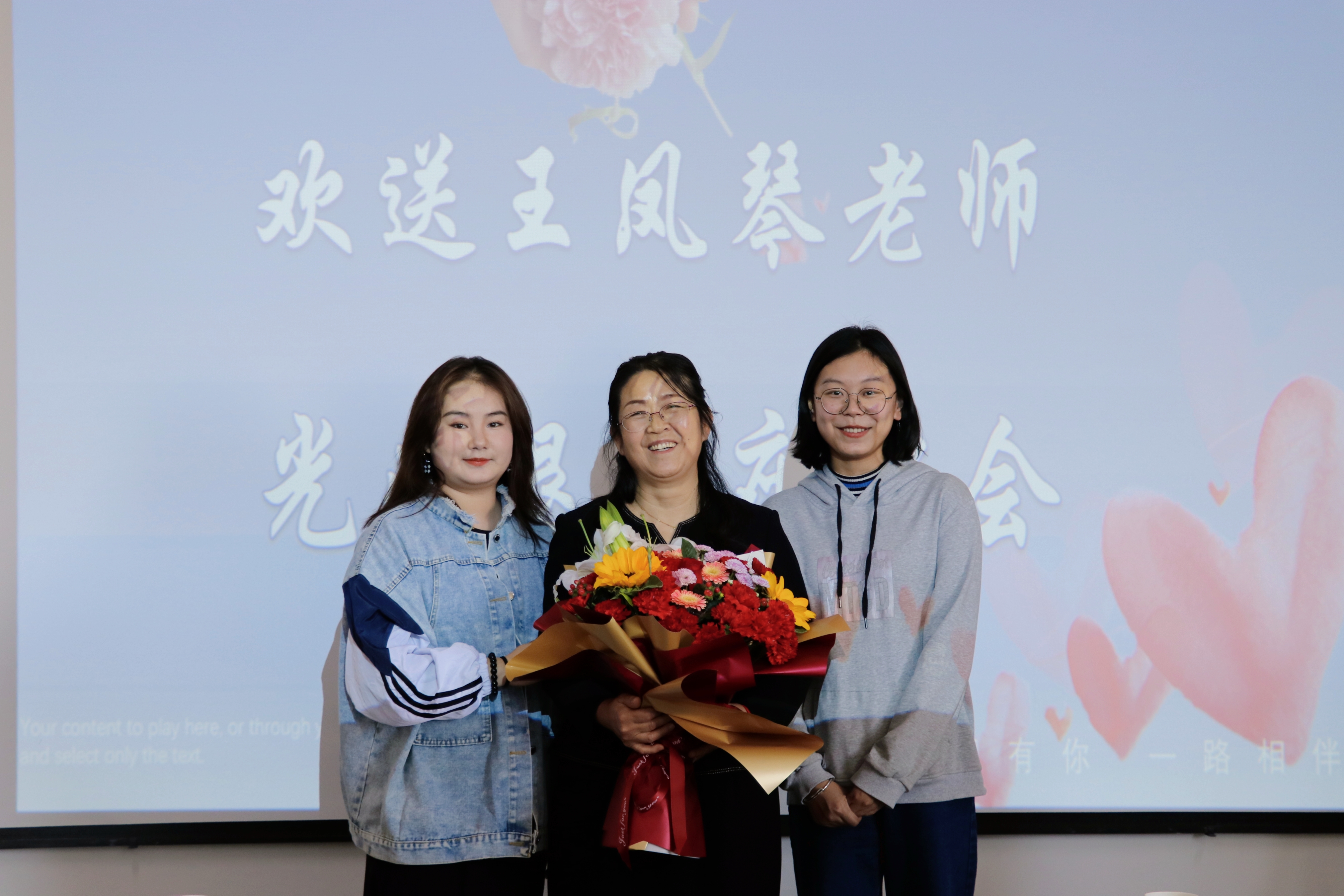 会议伊始,现场播放了由王凤琴教授过的历届学生自发拍摄的祝福视频,视频内容温暖灵动,表达了学生们的浓烈不舍与深厚感谢。随后,学生代表杨媛媛、何小倩为王凤琴献上鲜花并赠送纪念品,对王凤琴为同学们所付出的辛勤教诲表示感谢,并祝福她的退休生活多姿多彩、开心愉悦。