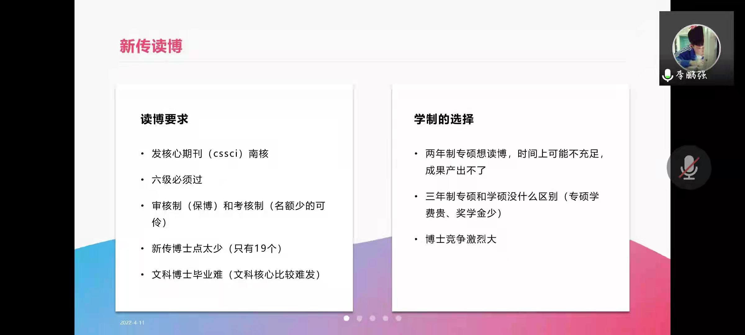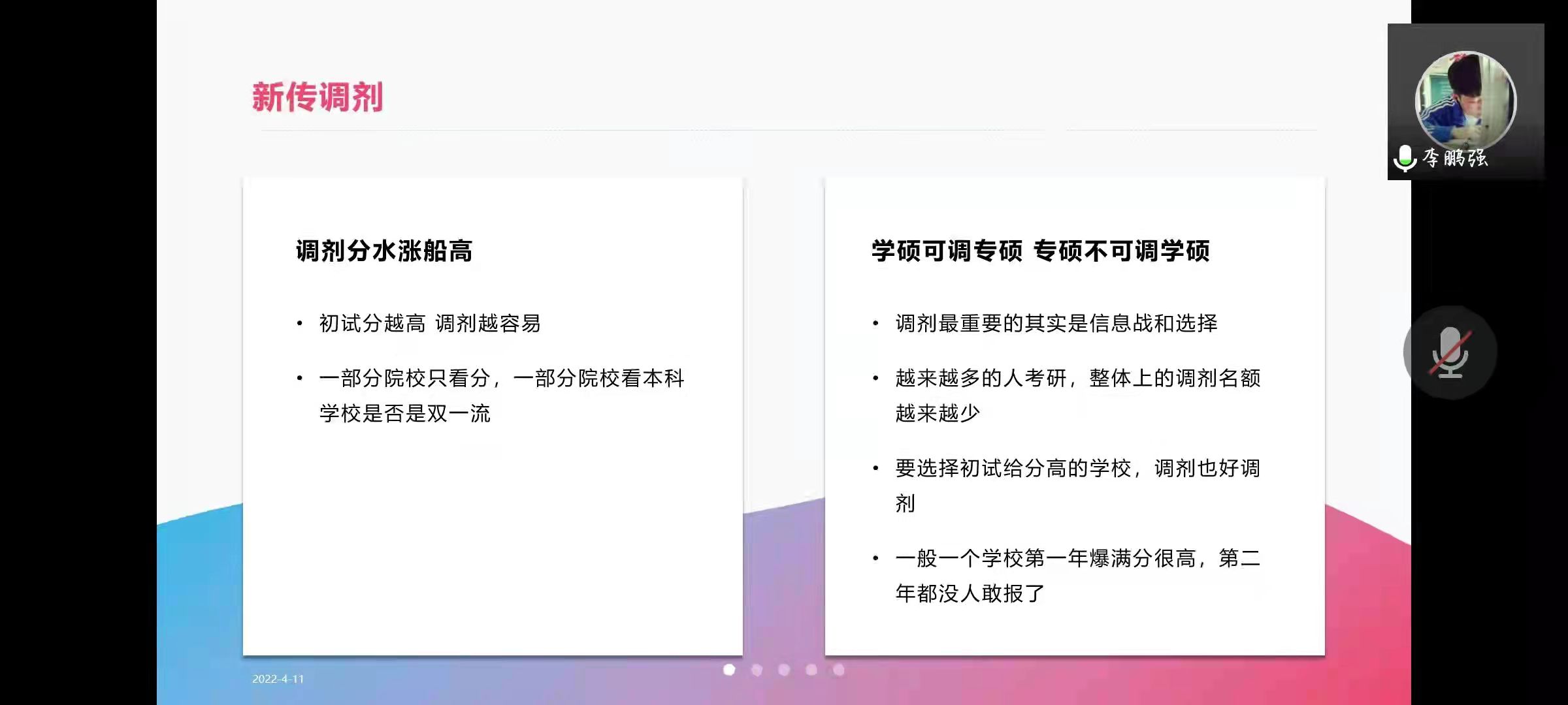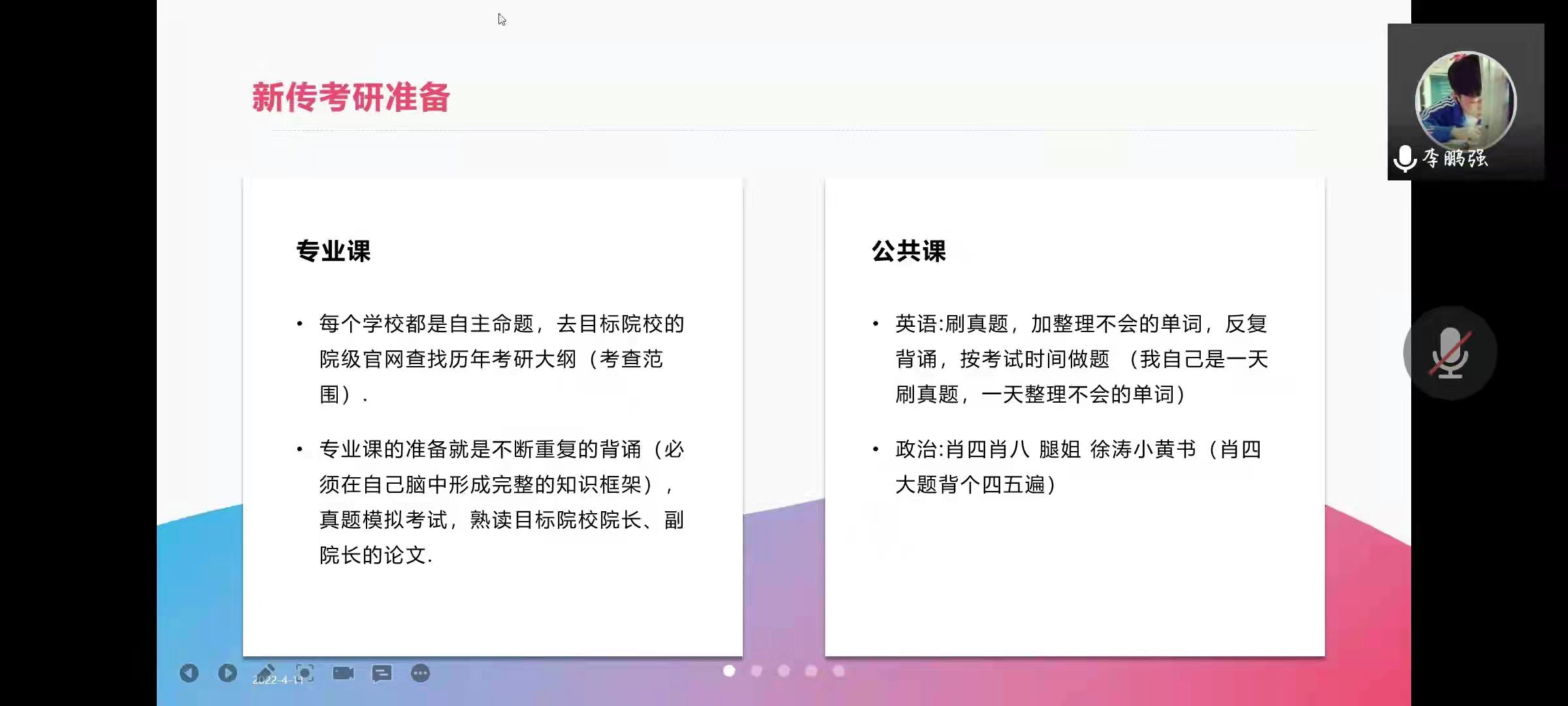 4月11日晚,我院通过线上会议形式开展了以“新传考研及调剂简介”为主题的考研经验分享讲座。讲座由研会青年发展研究中心在读研究生刘红彬同学主持,李鹏强同学主讲,我院部分学生参加。