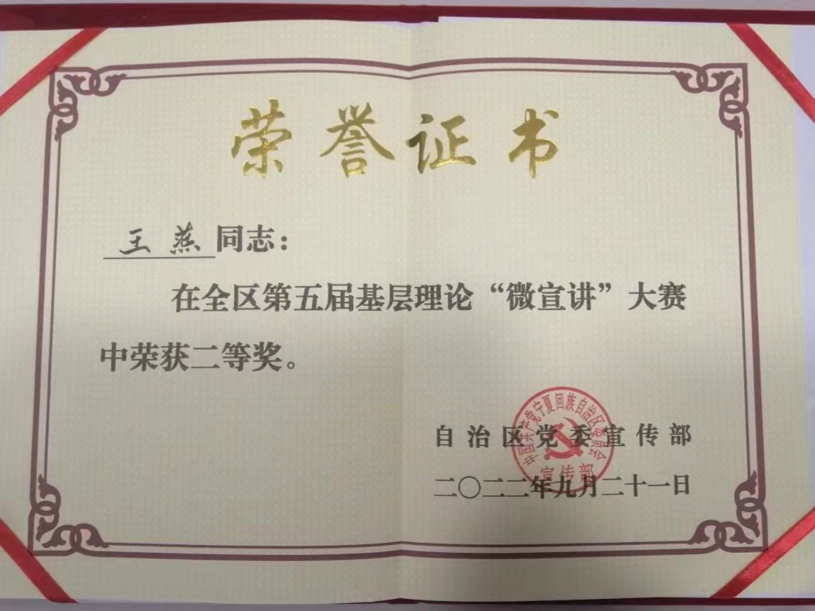 9月21日,由自治区党委宣传部主办、自治区党委讲师团承办的第五届基层理论“微宣讲”大赛决赛在宁夏广播电视台演播大厅落下帷幕。我校网红黑料 2020级学生王燕荣获二等奖。