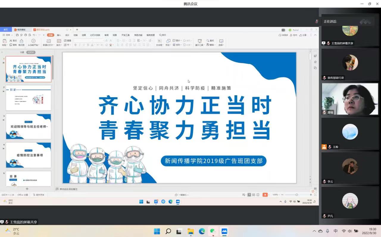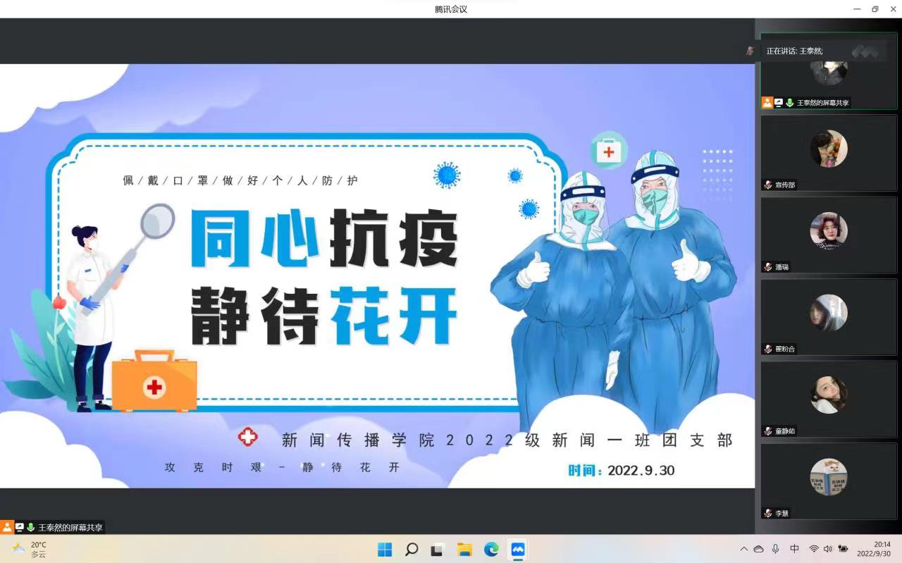 各班团支部书记主持班级活动,通过PPT展示、视频播放、感想交流等形式帮助同学们了解什么是冠状病毒、感染病例的症状、感染患者的临床表现以及预防新型冠状病毒感染的方法,号召同学们充分认识感染新型冠状病毒的危害并积极做好个人防护。2021级卓越人才新闻班团支部书记孙悦说:“大家要尽量少买或不买快递,严格遵守学校疫情防控规定,校园内务必须做到戴口罩,勤洗手,多通风,用实际行动共筑校园疫情防控安全屏障。”