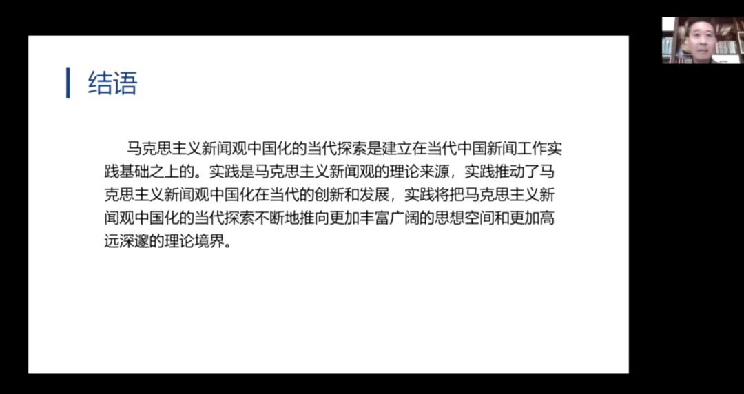 雷跃捷从党的二十大报告中“开辟马克思主义中国化时代化新境界”的号召入题,结合习近平总书记新闻事业重要讲话,分析了马克思主义新闻观中国化的内涵实质。雷跃捷以“什么是马克思主义新闻观的中国化”“马克思主义新闻观中国化的过程”两个问题为主线,深刻阐明了党的新闻舆论工作在历史上始终与不同时期的政治生态相适应,始终坚持在中国共产党的领导下,与党的治国方略保持一致,从而有效推进党和国家各项事业顺利发展。