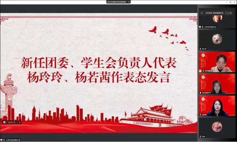 新任团委负责人杨玲玲、学生会负责人杨若茜作表态发言。她们代表新一届团学全体成员向大家表示:愿意接过重任,带领院团委、学生会服务好学生,并不断创新,取得新的辉煌。