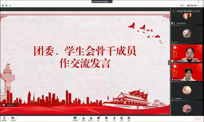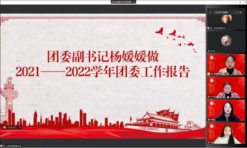 纳茹介绍与会人员,杨媛媛做2021-2022学年团委工作报告。在工作总结与回顾中,杨媛媛强调院团委加强了组织建设,发挥学生党员、团员的榜样性和示范性作用;不断加强思想政治引领;以新媒体平台为抓手,开辟宣传教育新阵地;加强实践育人,持续推进“第二课堂成绩单”制度的实施,着力打造主题鲜明的校园文化活动人。她提出了今后团委的目标与任务是:加强思想引领,推动校园文化建设,完善制度,规范团学骨干考核与培养,明晰职能定位,提高工作效能。