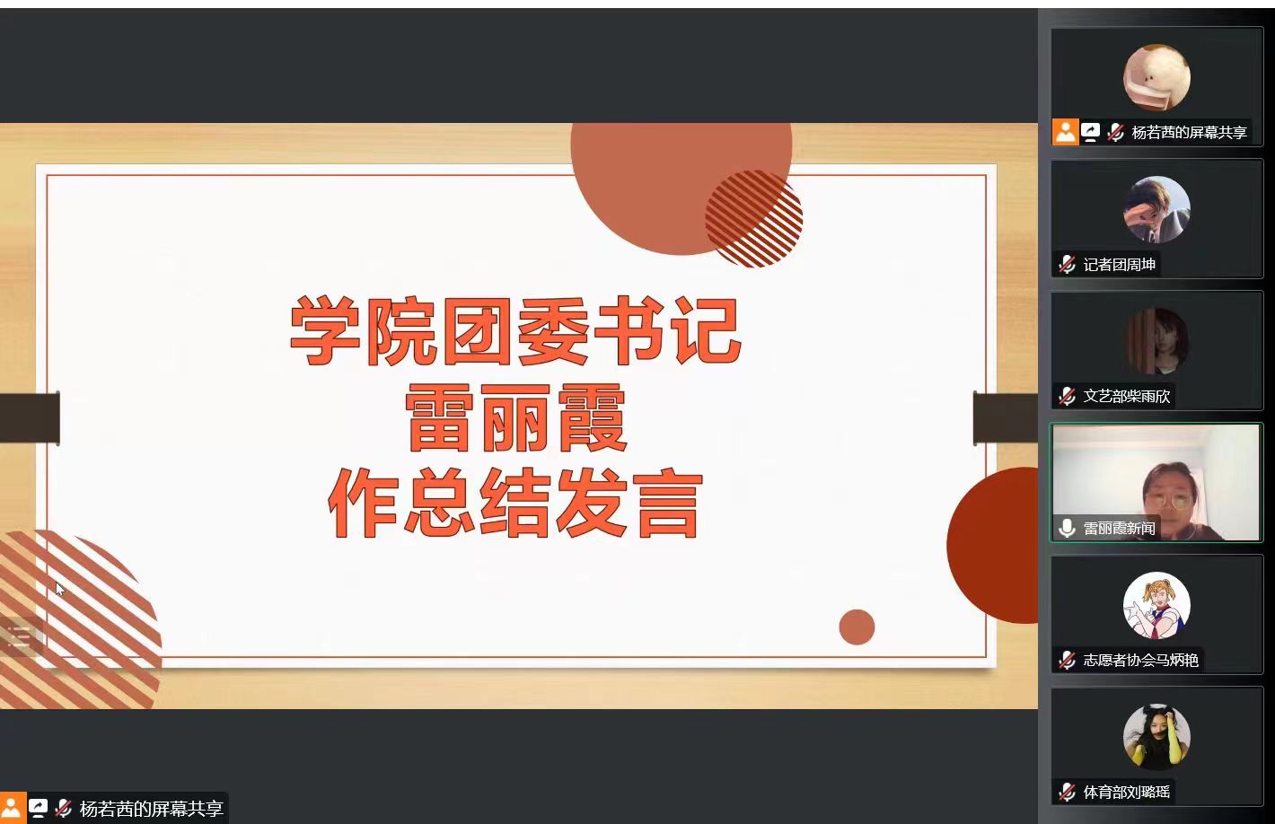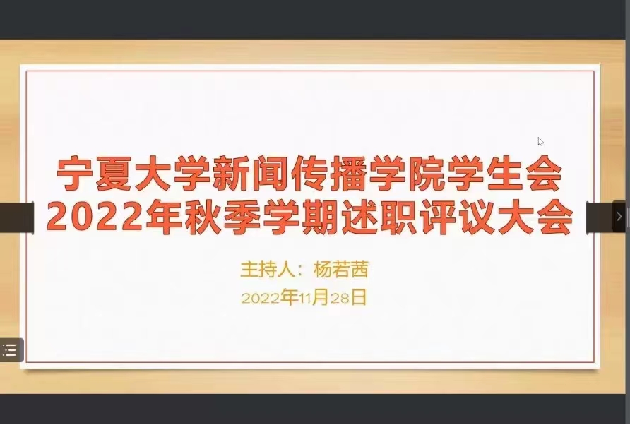 为进一步加强学生干部队伍建设,推动学生会工作科学化、规范化、精细化发展,我院学生会于11月28日在线上组织开展学生会2022年秋季学期述职评议大会。学院党总支书记潘瑞、团委书记雷丽霞出席并指导本次评议工作,学生会全体成员参加会议。会议由学生会执行主席杨若茜主持。