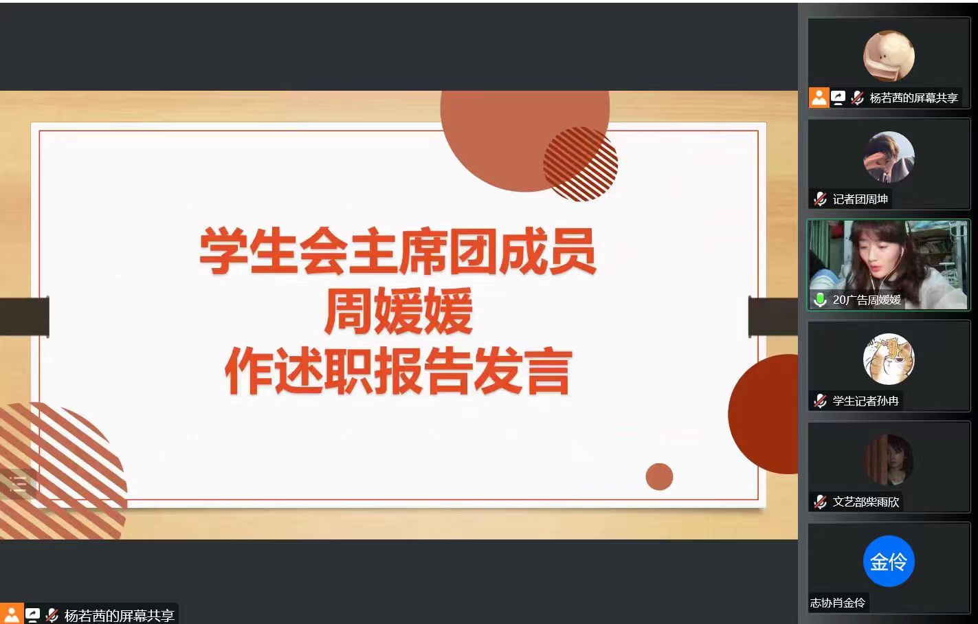 首先由主席团成员进行述职,各部门主要负责人依次述职。学生会主席团成员周媛媛汇报了本学期学生会组织的主要工作及改革情况。