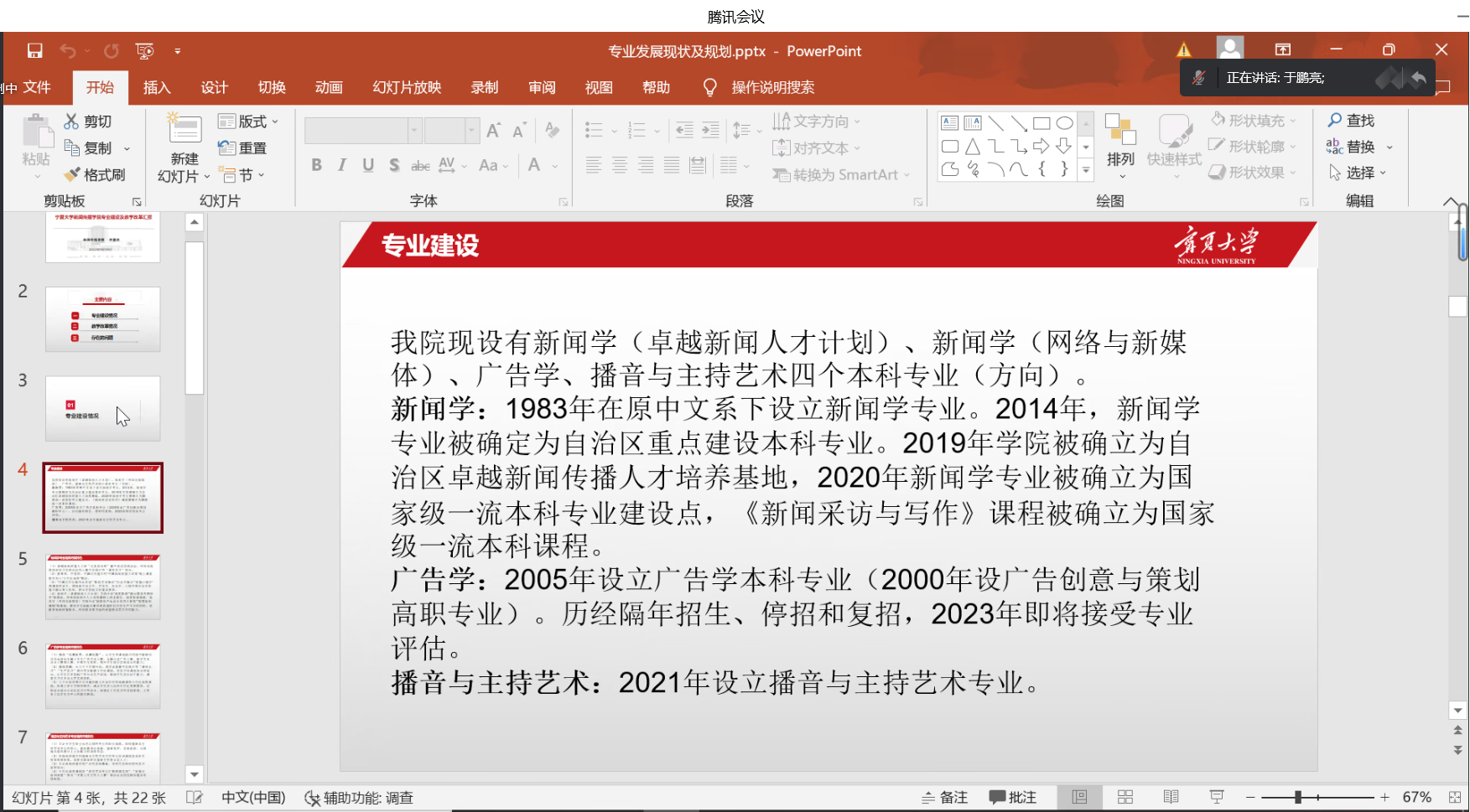 新闻传播学科方面的影响,结合文学、艺术、历史等领域,将其发展为本校新闻传播学的特色;二是建立跨学科师资团队;三是人才培养形成宁大特色,关注学生就业方向,在短视频制作、直播、新媒体产品设计方面形成特色。