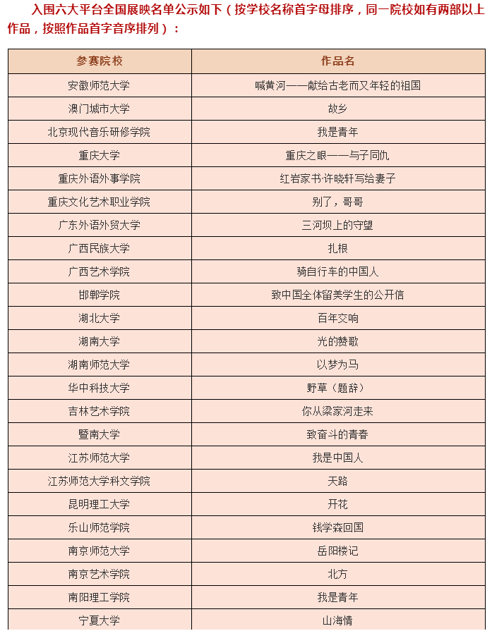 第24届齐越朗诵艺术节暨全国大学生朗诵大会自11月6日截止收取全国报名作品以来,共收到包括全国30个省、自治区、直辖市和特别行政区在内的272所高校提交的653部作品。经过评委会严谨评审,各展播平台审核把关,共有51部作品于12月13日正式登陆学习强国、人民视频、央视网、央视频、北京日报客户端和新浪微博六大平台进入展映期。