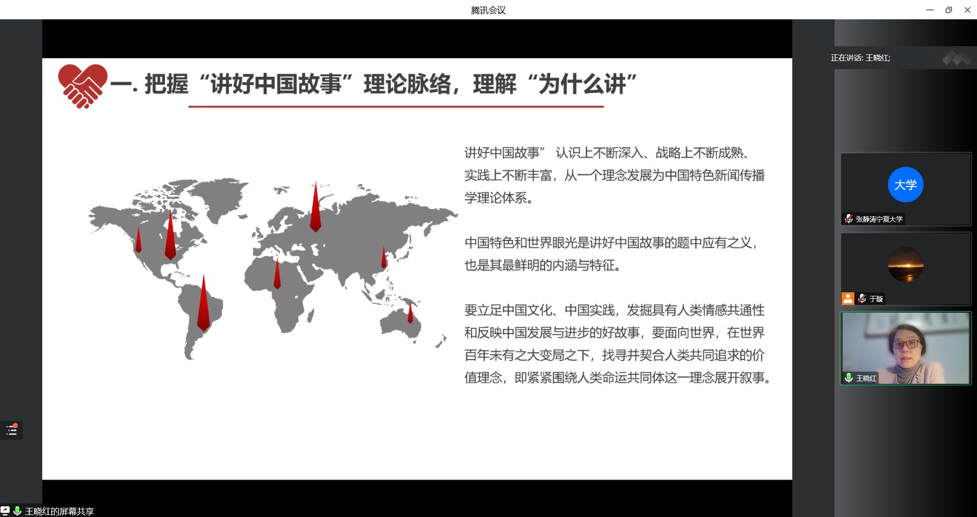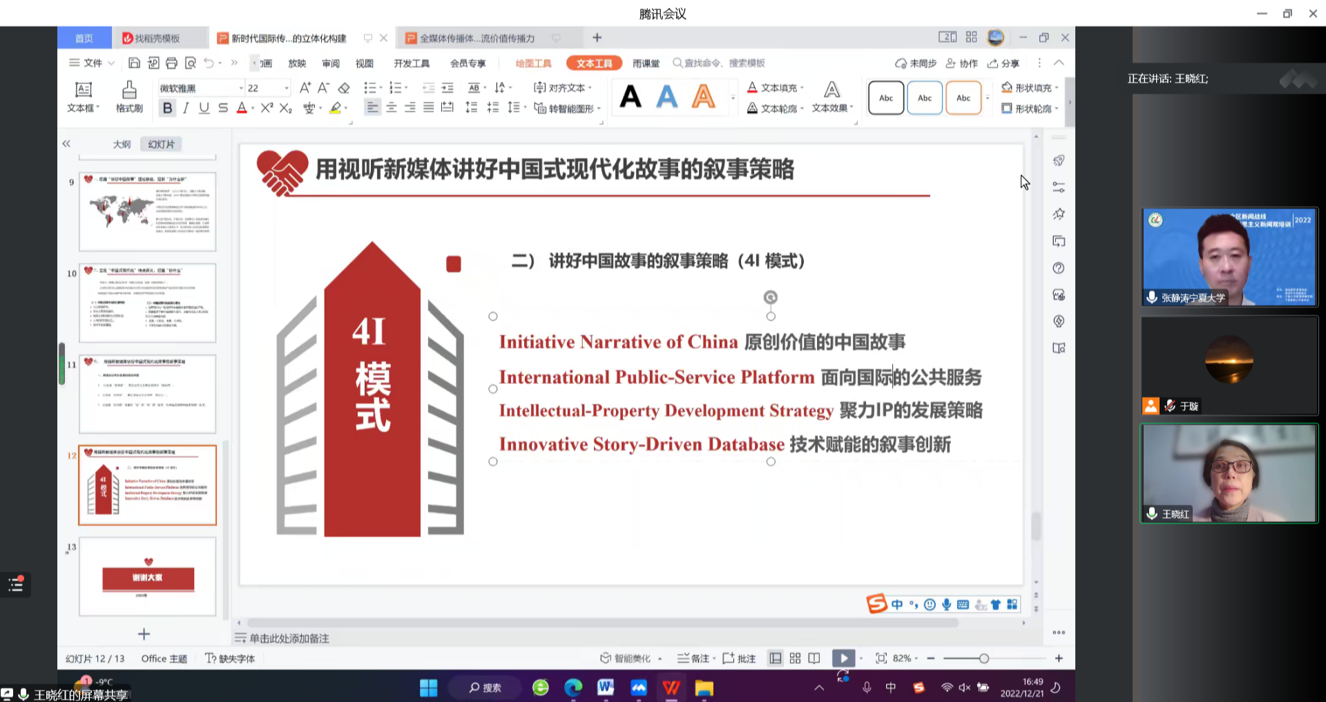 借助鲜活的研究案例,王晓红生动地讲授了媒体人“怎么讲好中国故事?”首先,要把握新媒体时代传播规律,转变讲故事的观念,在不同的文化社会背景下寻找自己和他人之间的共性,做到“说”和“做”相统一。其次,她结合课题研究结果分享了讲好中国故事的叙事策略(4I模式)——原创价值的中国故事、面向国际的社交服务、聚力IP的发展策略、技术赋能的叙事创新,并对其内容进行深刻阐释。她总结道,主流价值传播已经进入新的阶段,从“主旋律”到“新主流”,不仅要指向当下,更要回应时代之问,恪守主流之脊、创构平台之姿。