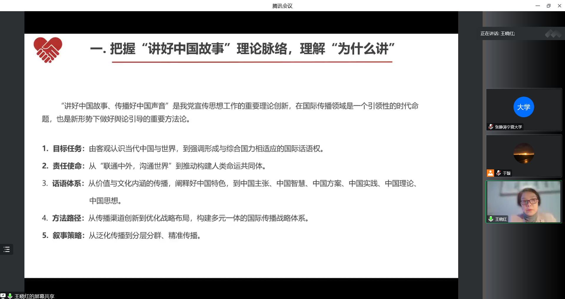 王晓红首先从目标任务、责任使命、话语体系、方法路径、叙事策略五个纬度带领大家梳理“讲好中国故事、传播中国声音”这一理论的发展脉络,并结合中国十年间的实践工作阐明了“为什么要讲好中国故事”这一重要课题。她指出,“讲好中国故事”是新时代加强国际传播能力的现实需要,更是向世界展示中国理论、中国思想的窗口。