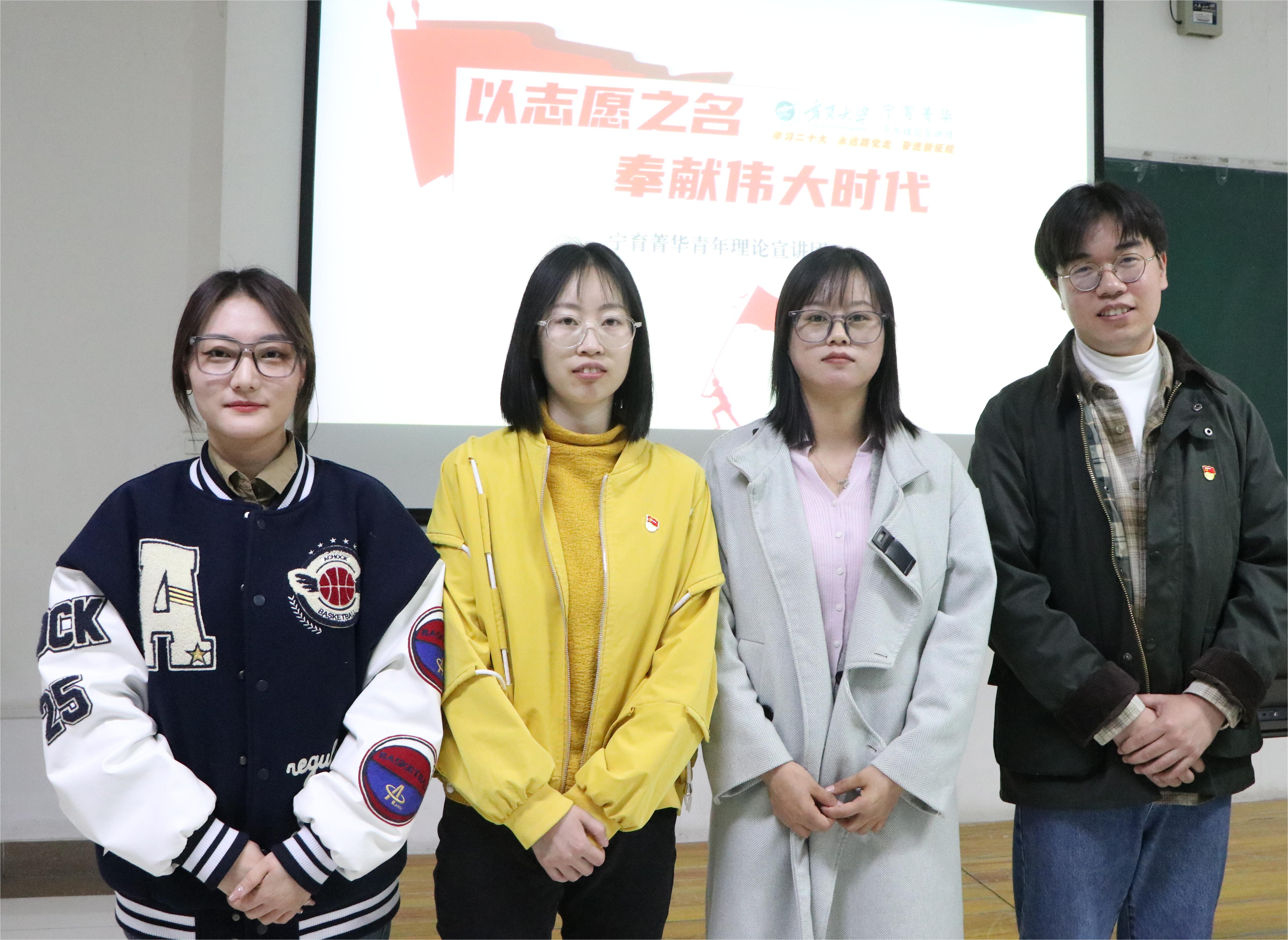 “宁育菁华”青年讲师团成员沈玉进、赵晏、马红玲、郭晓雪讲述他们与党同心、跟党奋斗的青春故事。我院团委书记雷丽霞老师主持,全院团委、学生会全体成员及发展对象参加会议。