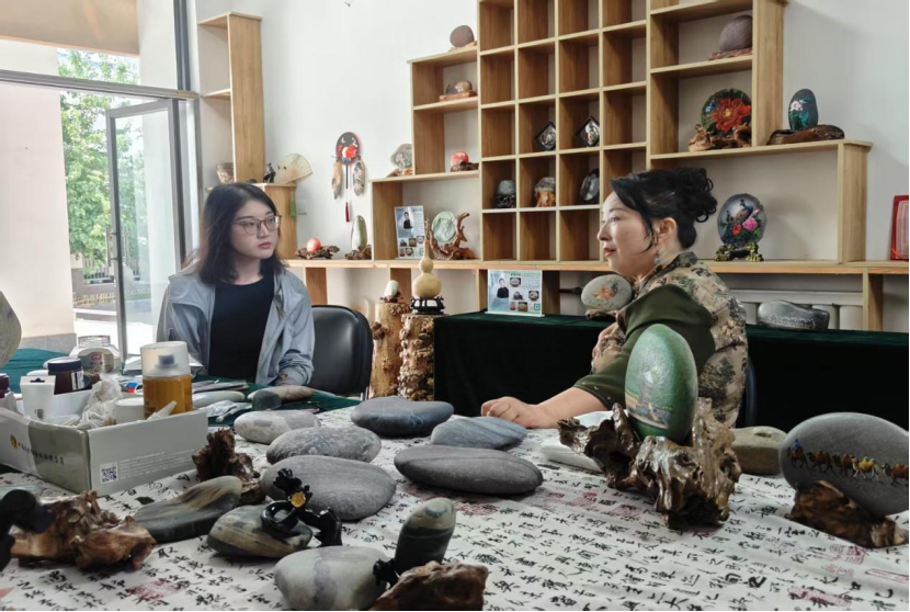紧接着,实训小组来到宁夏黄河石画传承人宋笑珍的工作室。通过墙上琳琅满目的石画作品,同学们感受到了黄河石画独特美感。在宋笑珍的讲解下,同学们了解到了黄河石画技艺的巧思。从斩获中国民间文艺最高奖“山花奖”的“宁夏二十一景”系列、法治主题31件组画等核心作品中,深刻感悟“以石为纸、变废为宝”。