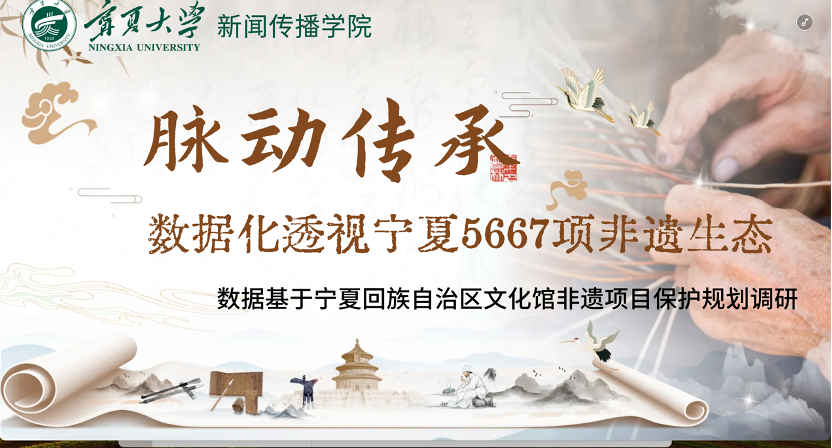 作品简介:《脉动传承·数据化透视宁夏5667项非遗生态》基于宁夏回族自治区文化馆非遗项目保护规划调研,在十四五收官之际的2025年通过数据新闻的创新方式,系统梳理了宁夏非遗在基本信息、保护路径、传承困境及发展模式等方面的现状与变化,生动呈现了“十四五”期间宁夏非遗保护的全新生态图景。作品借助详实的数据分析,真实反映了非遗保护的成就与挑战,突出了非遗与人民生活、乡村经济、数字技术、知识产权保护的密切关联,旨在引发公众对非遗保护的关注和共鸣,为未来非遗传承发展提供有益的经验借鉴。