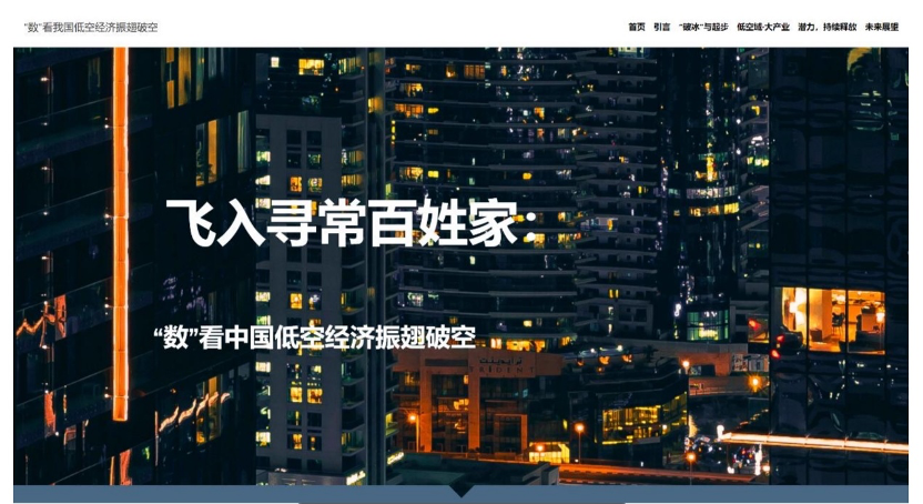 作品简介:我们的作品围绕“低空经济”的主题展开,详尽展示出低空经济在上中下游产业全覆盖的盛况,从而适应人民多样化需求,最终“飞入寻常百姓家”。从风起青萍到浪潮之巅,从宏观战略到微观技术,我们想做第一双触摸风帆的手,用数据为公众描绘出这片新蓝海的壮阔图景,让人们在这片空域中真正目睹:“中国,低空经济正在起飞!”