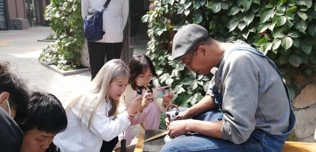 小分队从漫葡小镇南门出发,进入漫葡•天沐养颜温泉,在文创艺术街区观看老手艺人的工作,与工商学院的同学们交流拍摄心得。与此同时,腾讯短视频运营中心的老师耐心教小分队成员怎样保持相机在拍摄过程中的稳定以及运用不同的景别进行拍摄的方法。同学们在贺兰山天籁艺术馆进行实操训练,感受浓浓的艺术气息。
