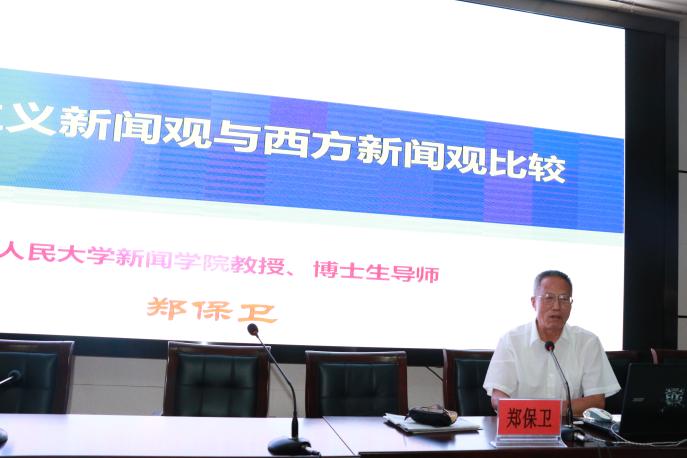 讲座中,郑保卫教授围绕习近平总书记关于新闻舆论工作的多次重要讲话精神,对马克思主义新闻观做了全面的讲解和分析。郑教授从马克思主义新闻观的内涵,结合“国内外的形式变化、国际传媒间的激烈竞争、西方新闻价值观和新闻界自身问题”四个方面,指出我国新闻领域当前面临的影响和挑战,表明学习和践行马克思主义新闻观要做到“真学,真懂,真信,真用”。