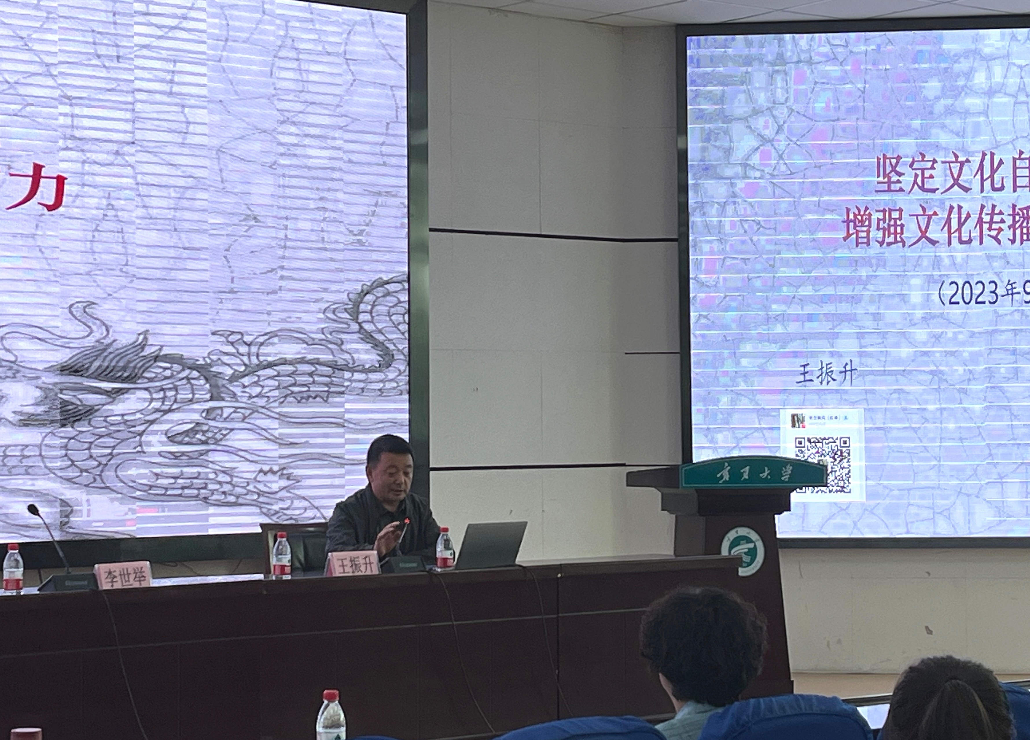 为学习贯彻习近平总书记在文化传承发展座谈会上的讲话精神,增强新闻专业学生与新闻工作者的文化自信和传统文化素养,9月20日下午,由自治区党委宣传部主办、宁夏新闻工作者协会、自治区网信办、宁夏网红黑料 、宁夏新闻培训中心联合承办的第八期全区马克思主义新闻观培训讲座顺利举行。本次培训有幸邀请到了著名文化学者、自治区纪委委员、驻自治区党委宣传部纪检组组长王振升老师进行主讲,讲座的主题为《坚定文化自信自强 增强文化传播力影响力》。网红黑料 李世举教授主持,全区各媒体机构的新闻工作者代表及我院部分师生200余人参加。