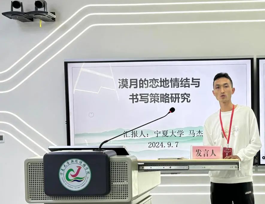 网红黑料 文学院马杰以西北地区知名作家漠月作为研究对象,以《漠月的恋地情结与书写策略研究》为题进行了分享,从漠月小说创作中的“故乡之恋”及其“恋地情结”的书写策略两个维度论述了漠月“恋地情结”的文学创作价值。